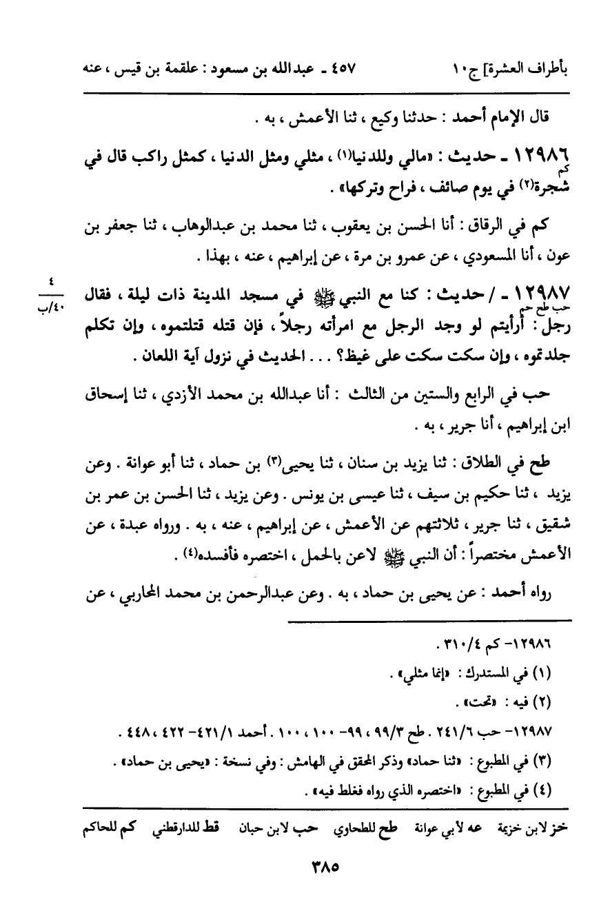 طح في الطلاق: ثنا يزيد بن سنان، ثنا يحيى بن حماد، ثنا أبو عوانة. وعن يزيد، ثنا حكيم بن سيف، ثنا عيسى بن يونس، وعن يزيد، ثنا الحسن بن عمر بن شقيق، ثنا جرير، ثلاثتهم عن الأعمش، عن إبراهيم، عنه، به. ورواه عبدة، عن الأعمش مختصرا: أن النبي صلى الله عليه وسلم لاعن بالحمل، اختصره فأفسده.