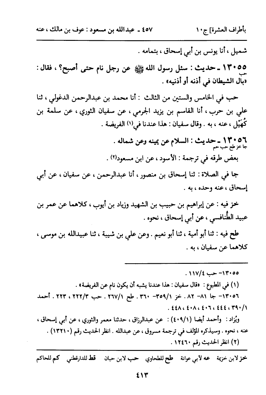 13055 - حديث (حب) : سئل رسول الله صلى الله عليه وسلم عن رجل نام حتى أصبح؟ ، فقال: " بال الشيطان في أذنه أو أذنيه ".