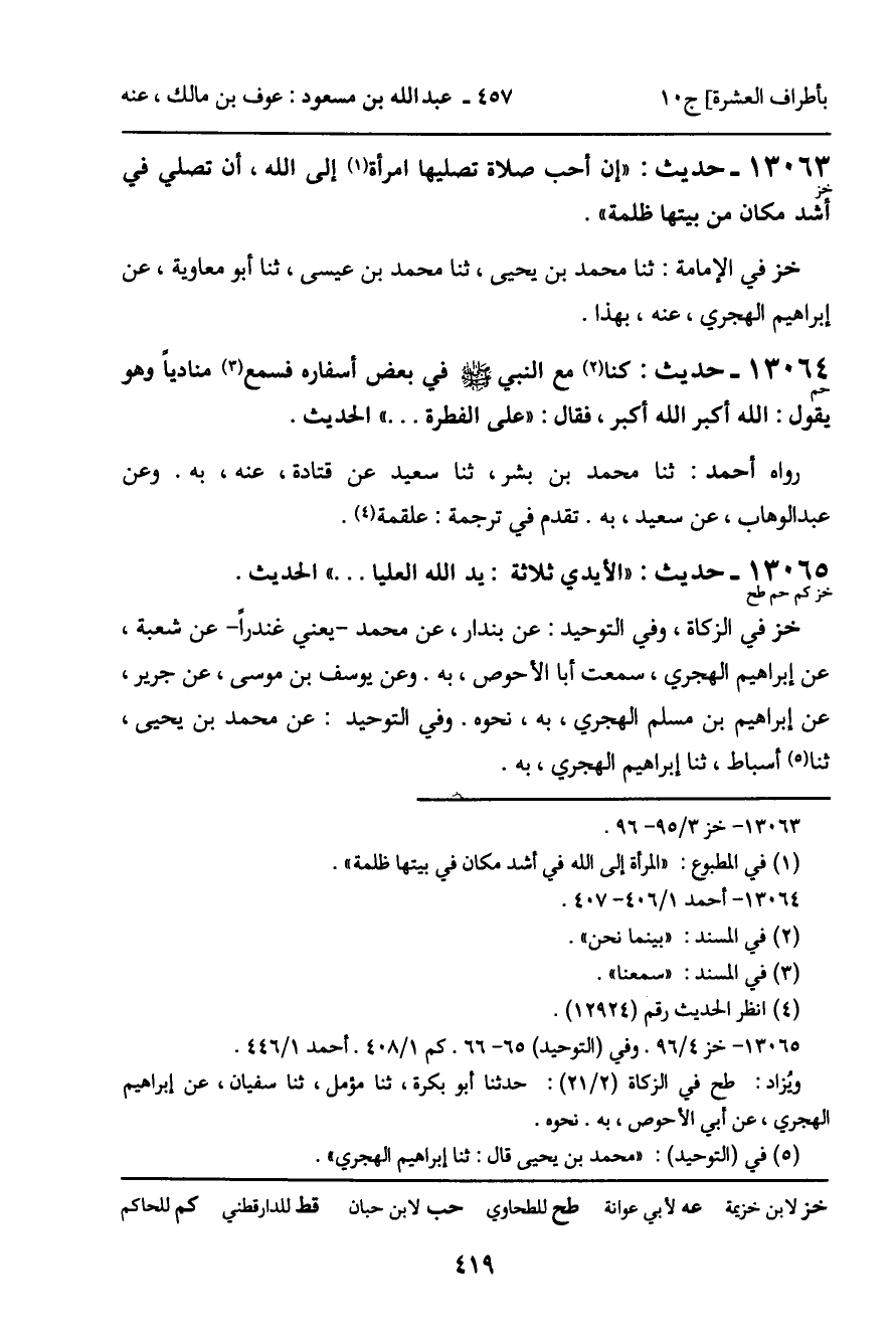 خز في الزكاة، وفي التوحيد: عن بندار، عن محمد يعني: غندرا، عن شعبة، عن إبراهيم الهجري، سمعت أبا الأحوص، به. وعن يوسف بن موسى، عن جرير، عن إبراهيم بن مسلم الهجري، به، نحوه. وفي التوحيد: عن محمد بن يحيى، ثنا أسباط، ثنا إبراهيم الهجري، به.