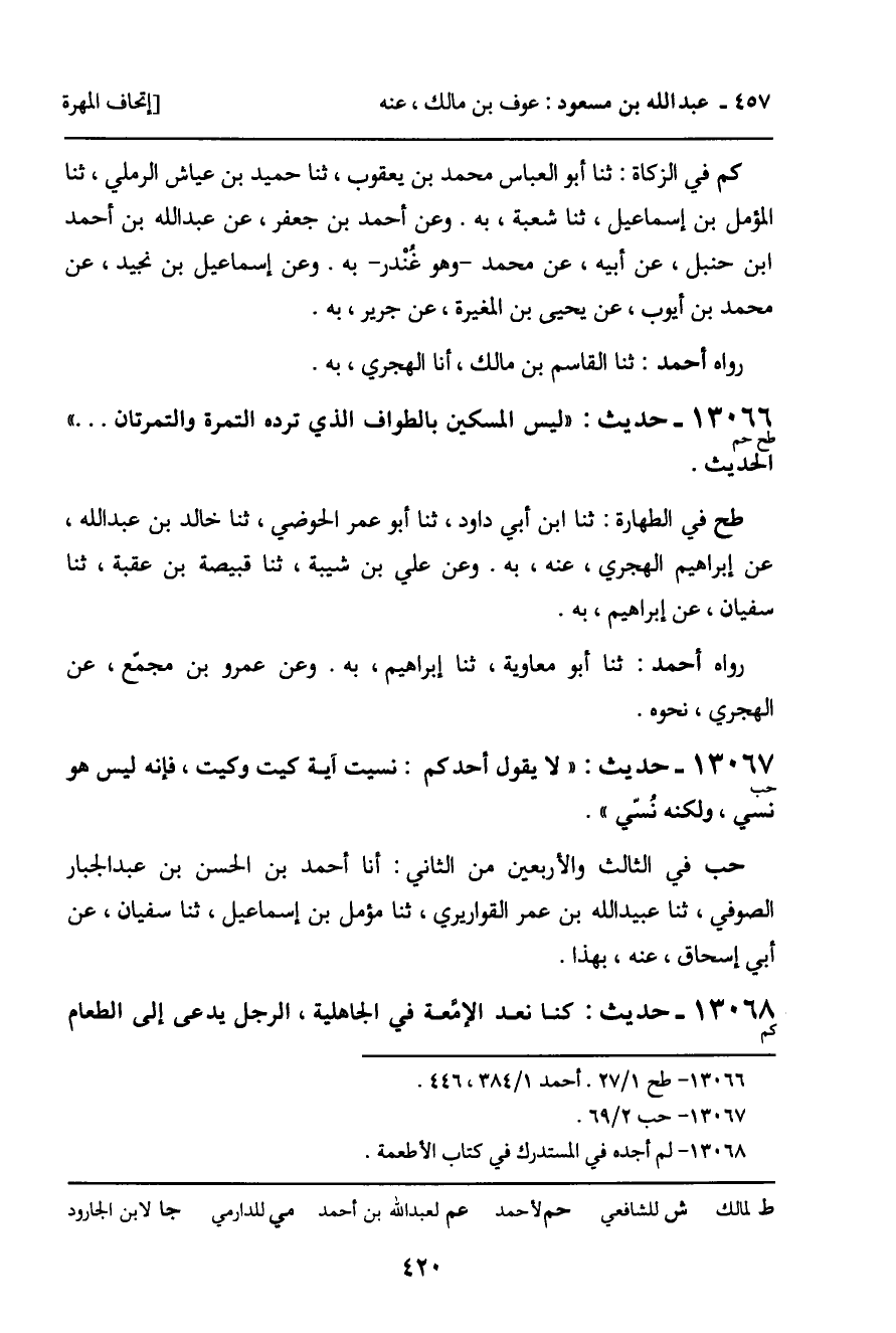 13066 - حديث (طح حم) : " ليس المسكين بالطواف الذي ترده التمرة والتمرتان. . . " الحديث.