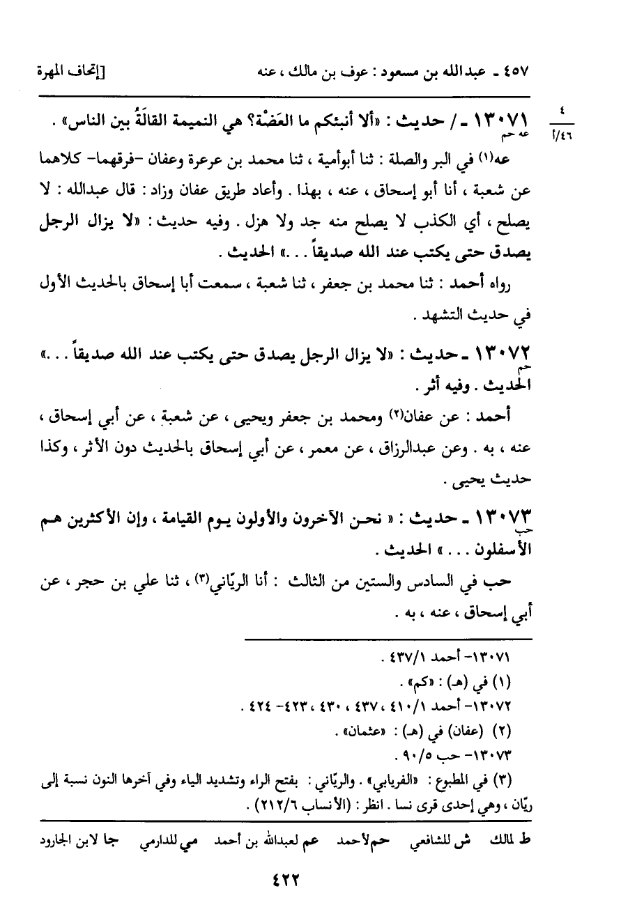 13071 - حديث (عه حم) : " ألا أنبئكم ما العضة؟ هي النميمة القالة بين الناس ".
