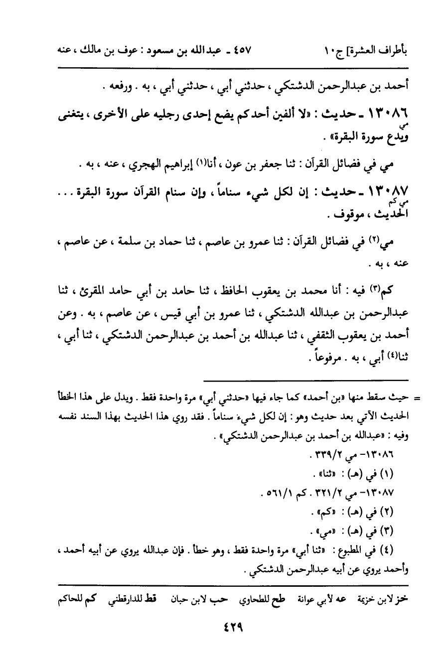 13086 - حديث (مي) : " لا ألفين أحدكم يضع إحدى رجليه على الأخرى، يتغنى ويدع سورة البقرة ".