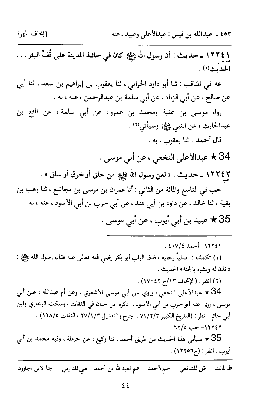 12241 - حديث (عه حب) : " أن رسول الله صلى الله عليه وسلم كان في حائط المدينة على قف البئر. . . " الحديث.