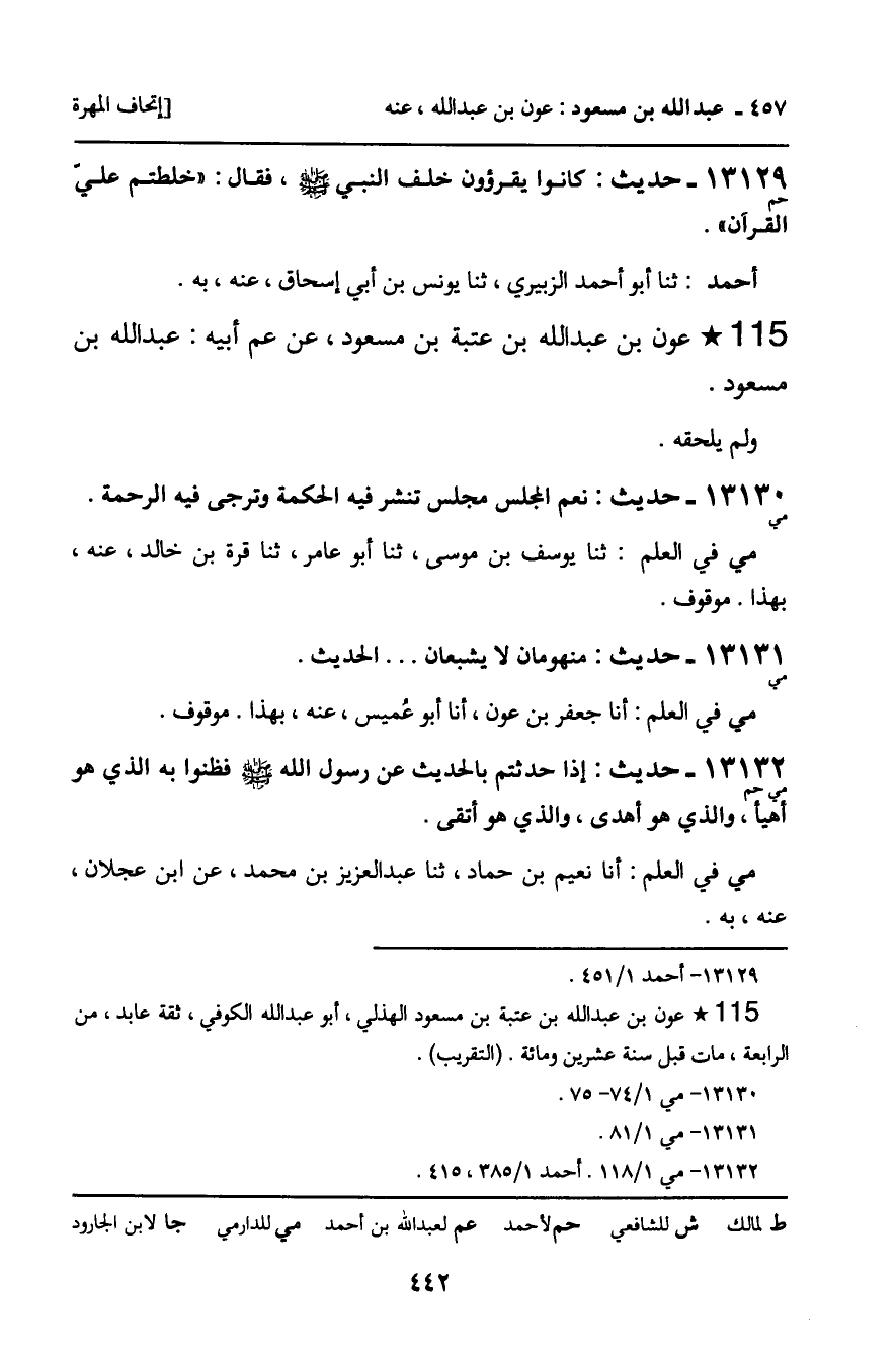 13130 - حديث (مي) : عون بن عبد الله بن عتبة بن مسعود، عن عم أبيه: عبد الله بن مسعود. " نعم المجلس مجلس تنشر فيه الحكمة وترجى فيه الرحمة ".
