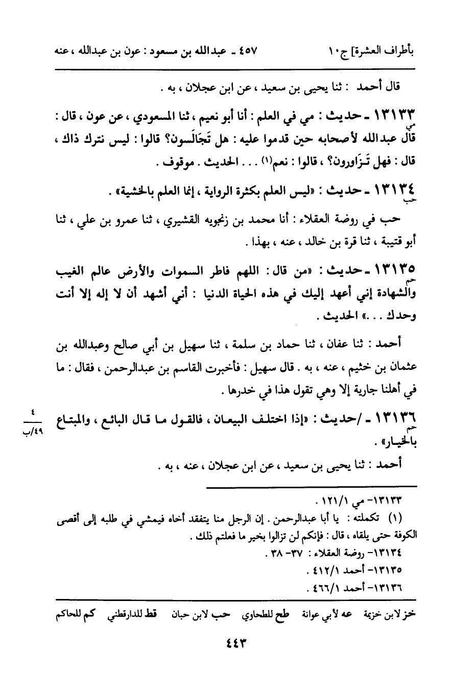 13133 - حديث (مي) في العلم: أنا أبو نعيم، ثنا المسعودي، عن عون، قال: قال عبد الله لأصحابه حين قدموا عليه: " هل تجالسون؟ قالوا: ليس نترك ذاك، قال: فهل تزاورون؟ ، قالوا: نعم. . . " الحديث. موقوف.