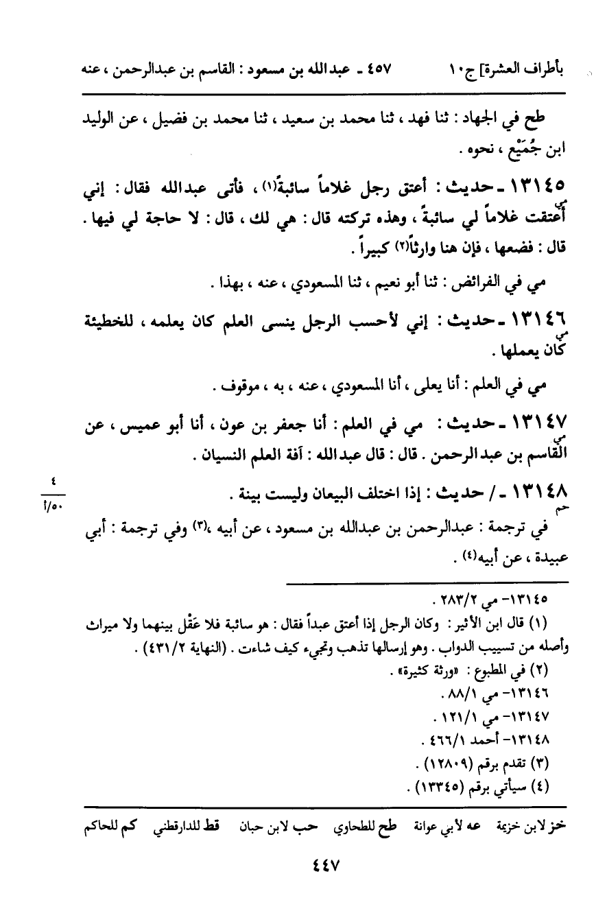 13145 - حديث (مي) : أعتق رجل غلاما سائبة، فأتى عبد الله فقال: إني أعتقت غلاما لي سائبة، وهذه تركته قال: هي لك، قال: لا حاجة لي فيها. قال: فضعها، فإن هنا وارثا كبيرا
