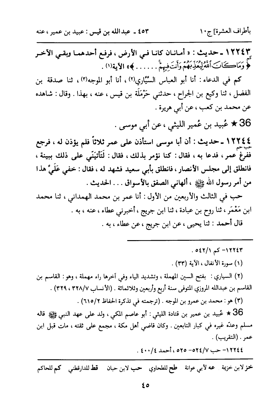 12244 - حديث (حب حم) : " أن أبا موسى استأذن على عمر ثلاثا فلم يؤذن له، فرجع ففرغ عمر، فدعا به، فقال: كنا نؤمر بذلك، فقال: لتأتيني على ذلك ببينة، فانطلق إلى مجلس الأنصار، فانطلق بأبي سعيد فشهد له، فقال: خفي علي هذا من أمر رسول الله صلى الله عليه وسلم، ألهاني الصفق بالأسواق. . . . " الحديث.