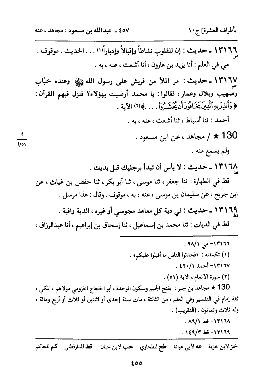 13168 - حديث (قط) : مجاهد، عن ابن مسعود " لا بأس أن تبدأ برجليك قبل يديك ".