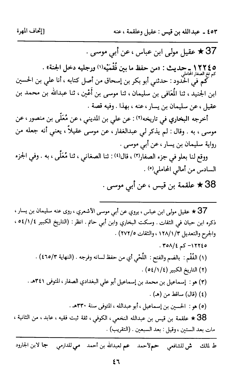 12245 - حديث (كم تخ الصفار المحاملي) : " من حفظ ما بين فقميه ورجليه دخل الجنة ".