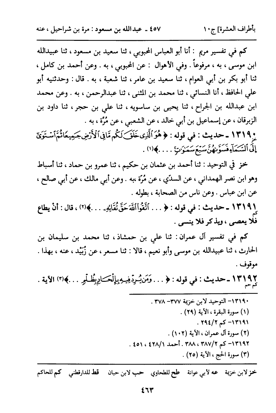 كم في التفسير: ثنا أبو العباس محمد بن يعقوب، ثنا أسيد بن عاصم، ثنا الحسين بن حفص، ثنا سفيان، عن زبيد، عن مرة، به. وقال: صحيح على شرط مسلم، وقد رفعه شعبة عن السدي، عن مرة، أناه أبو الحسن محمد بن موسى بن عمران الفقيه من أصل كتابه، ثنا إبراهيم بن أبي طالب، ثنا أبو هاشم زياد بن أيوب، أنا يزيد بن هارون، أنا شعبة، عن السدي، عن مرة، به.