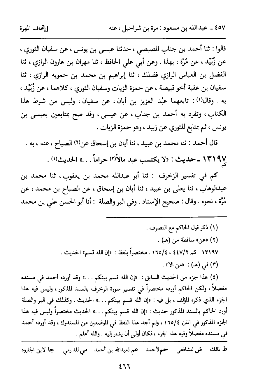 كم في تفسير الزخرف: ثنا أبو عبد الله محمد بن يعقوب، ثنا محمد بن عبد الوهاب، ثنا يعلى بن عبيد، ثنا أبان بن إسحاق، عن الصباح بن محمد، عن مرة، نحوه. وقال: صحيح الأسناد. وفي البر والصلة: أنا أبو الحسن علي بن محمد