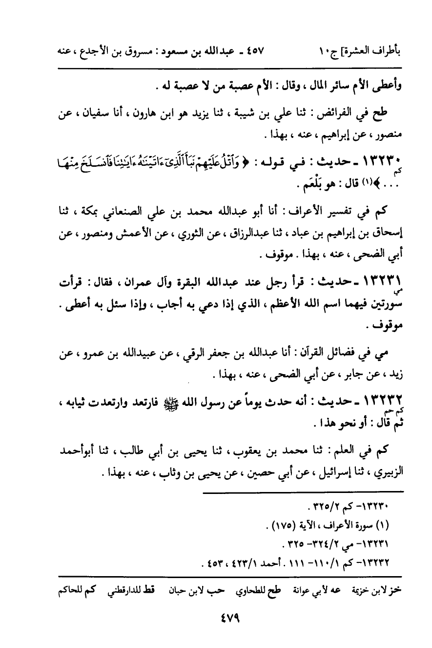 كم في تفسير الأعراف: أنا أبو عبد الله محمد بن علي الصنعاني بمكة، ثنا إسحاق بن إبراهيم بن عباد، ثنا عبد الرزاق، عن الثوري، عن الأعمش ومنصور، عن أبي الضحى، عنه، بهذا. موقوف.