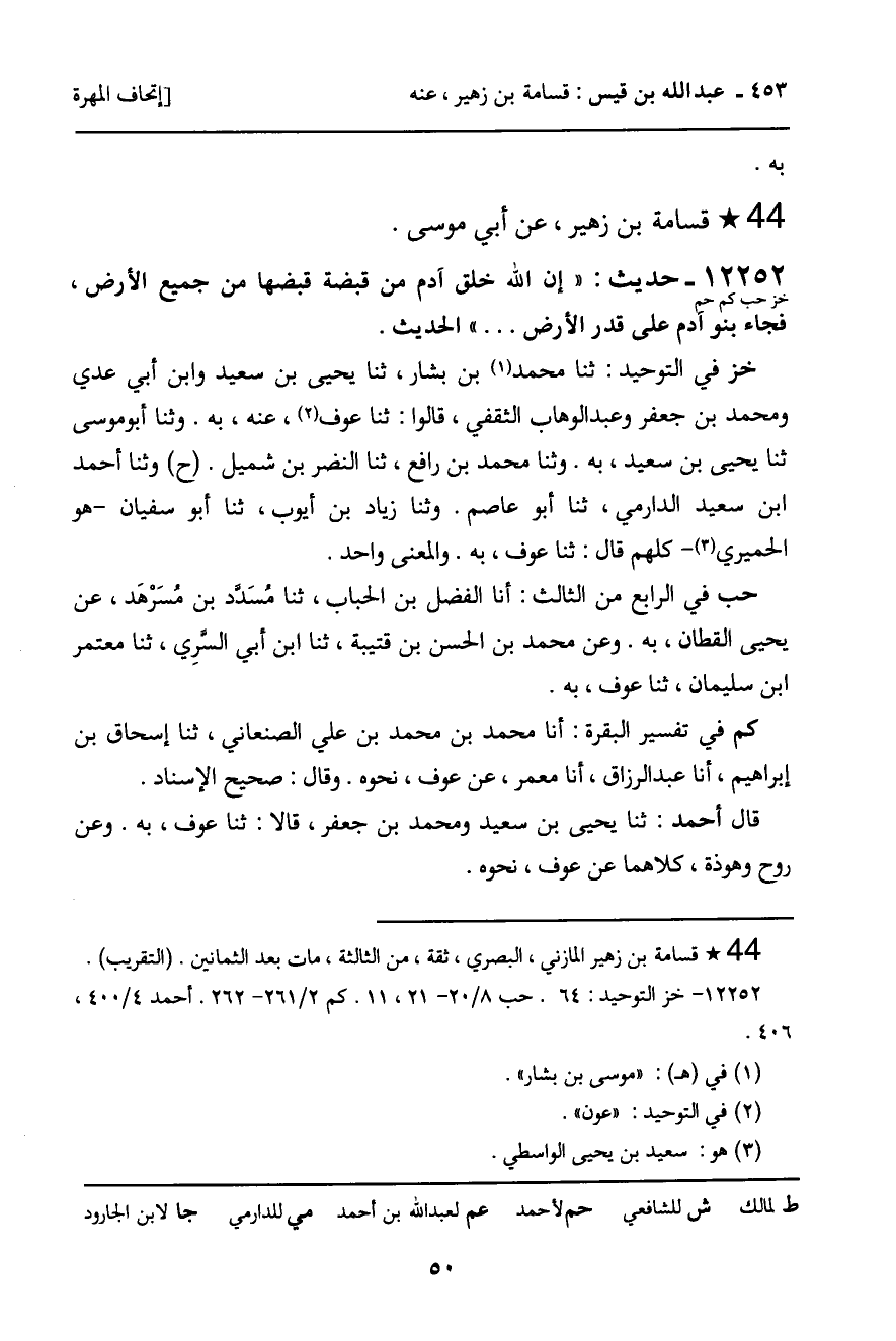 خز في التوحيد: ثنا محمد بن بشار، ثنا يحيى بن سعيد، وابن أبي عدي، ومحمد بن جعفر، وعبد الوهاب الثقفي، قالوا: ثنا عوف، عنه، به. وثنا أبو موسى، ثنا يحيى بن سعيد، به. وثنا محمد بن رافع، ثنا النضر بن شميل. ح وثنا أبو موسى، ثنا يحيى بن سعيد، به. وثنا محمد بن رافع، ثنا النضر بن شميل. ح وثنا أحمد بن سعيد الدارمي، ثنا أبو عاصم. وثنا زياد بن أيوب، ثنا أبو سفيان هو الحميري، كلهم قال: ثنا عوف، به. والمعنى واحد.