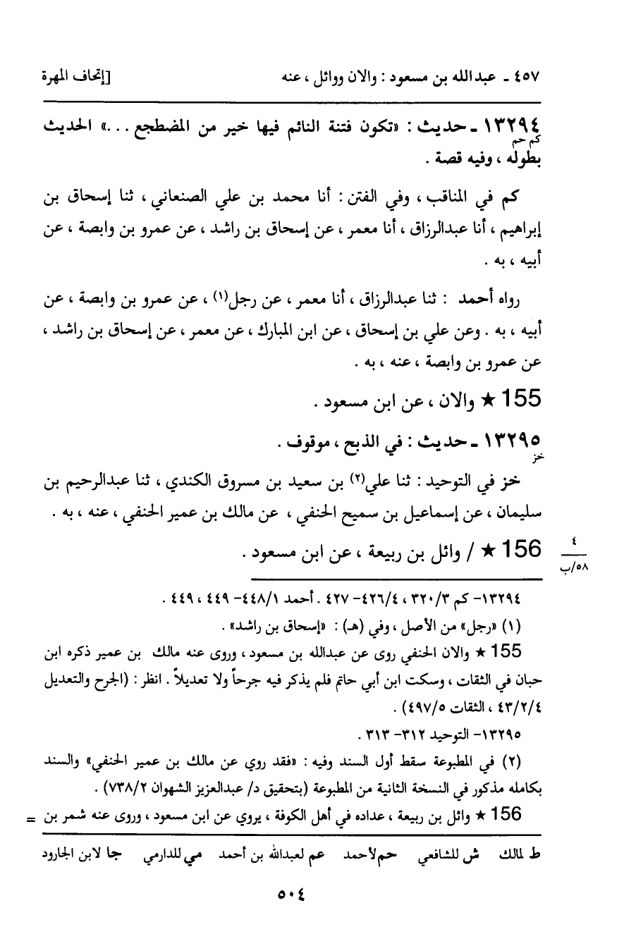 13294 - حديث (كم حم) : وابصة بن معبد الأسدي، عن ابن مسعود " تكون فتنة النائم فيها خير من المضطجع. . . . " الحديث بطوله، وفيه قصة.