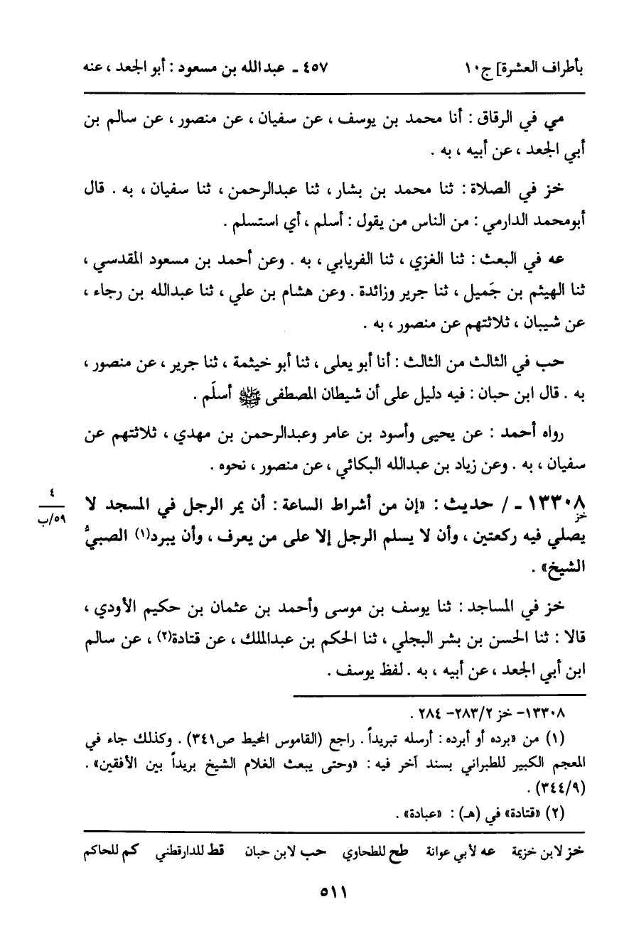 13308 - حديث (خز) : " إن من أشراط الساعة: أن يمر الرجل في المسجد لا يصلي فيه ركعتين، وأن لا يسلم الرجل إلا على من يعرف، وأن يبرد الصبي الشيخ ".