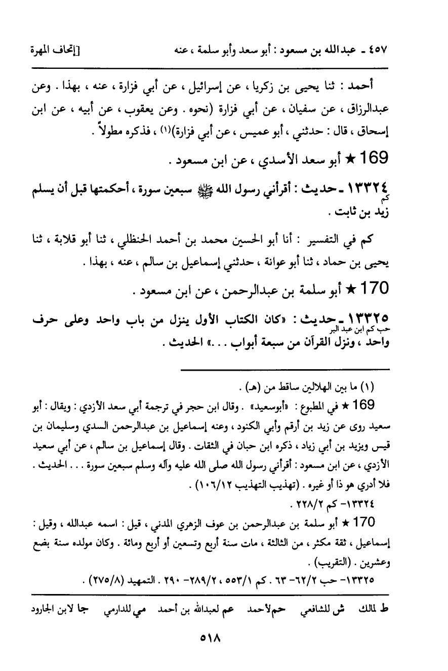 13325 - حديث (حب كم ابن عبد البر) : أبو سلمة بن عبد الرحمن، عن ابن مسعود " كان الكتاب الأول ينزل من باب واحد وعلى حرف واحد، ونزل القرآن من سبعة أبواب. . . " الحديث.
