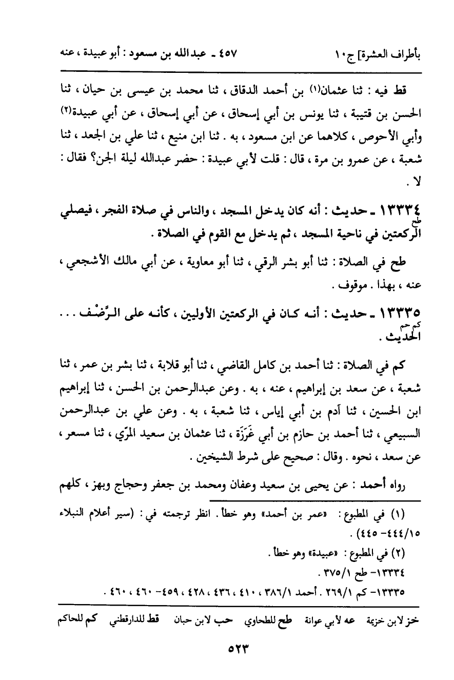 كم في الصلاة: ثنا أحمد بن كامل القاضي، ثنا أبو قلابة، ثنا بشر بن عمر، ثنا شعبة، عن سعد بن إبراهيم، عنه، به. وعن عبد الرحمن بن الحسن، ثنا إبراهيم بن الحسين، ثنا آدم بن أبي إياس، ثنا شعبة، به. وعن علي بن عبد الرحمن السبيعي، ثنا أحمد بن حازم بن أبي غرزة، ثنا عثمان بن سعيد المري، ثنا مسعر، عن سعد، نحوه. وقال: صحيح على شرط الشيخين.