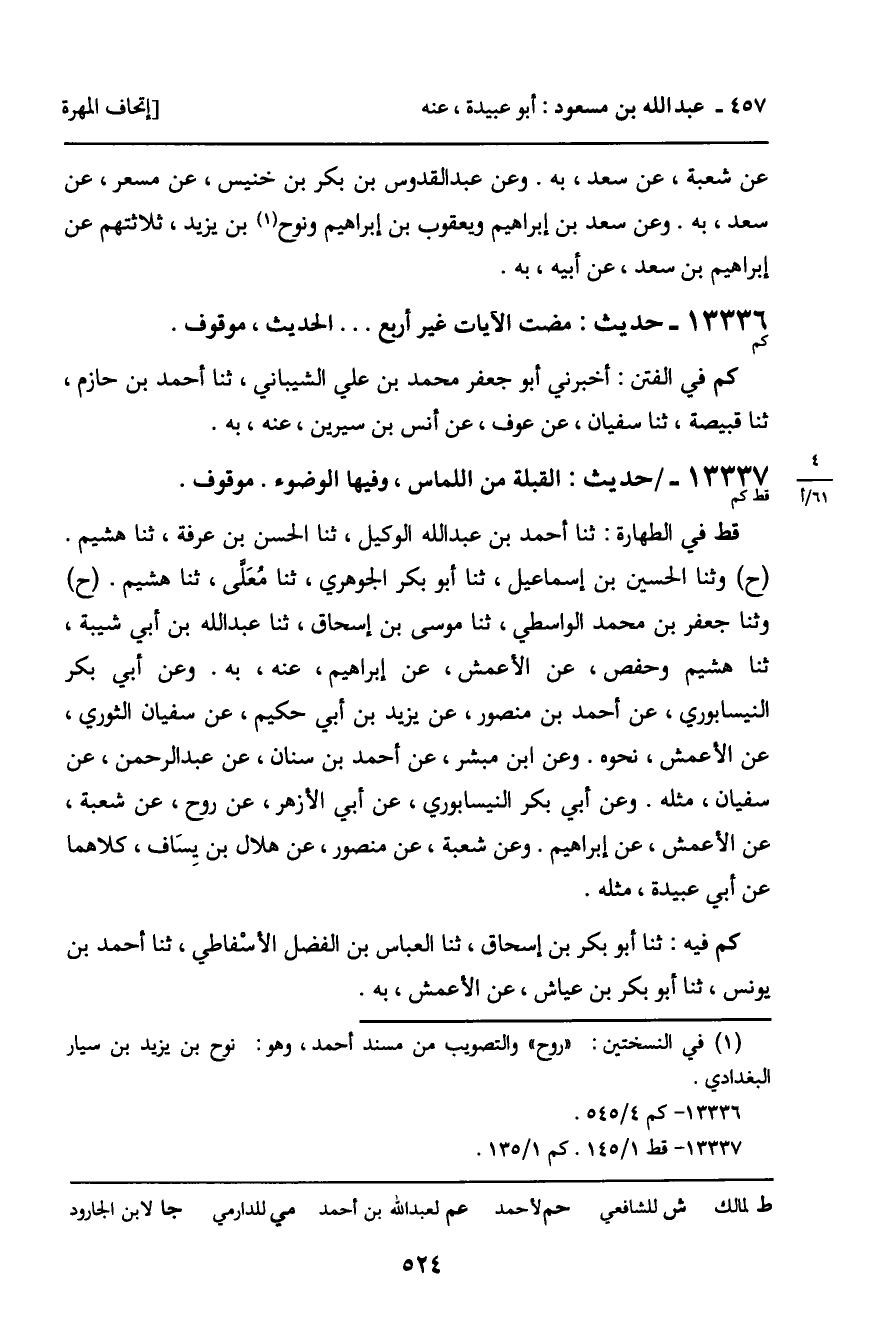 ح وثنا الحسين بن إسماعيل، ثنا أبو بكر الجوهري، ثنا معلى، ثنا هشيم. ح وثنا جعفر بن محمد الواسطي، ثنا موسى بن إسحاق، ثنا عبد الله بن أبي شيبة، ثنا هشيم، وحفص، عن الأعمش، عن إبراهيم، عنه، به. وعن أبي بكر النيسابوري، عن أحمد بن منصور، عن يزيد بن أبي حكيم، عن سفيان الثوري، عن الأعمش، نحوه. وعن ابن مبشر، عن أحمد بن سنان، وعن عبد الرحمن، عن سفيان، مثله. وعن أبي بكر النيسابوري، عن أبي الأزهر، عن روح، عن شعبة، عن الأعمش، عن إبراهيم. وعن شعبة، عن منصور، عن هلال بن يساف، كلاهما عن أبي عبيدة، مثله.