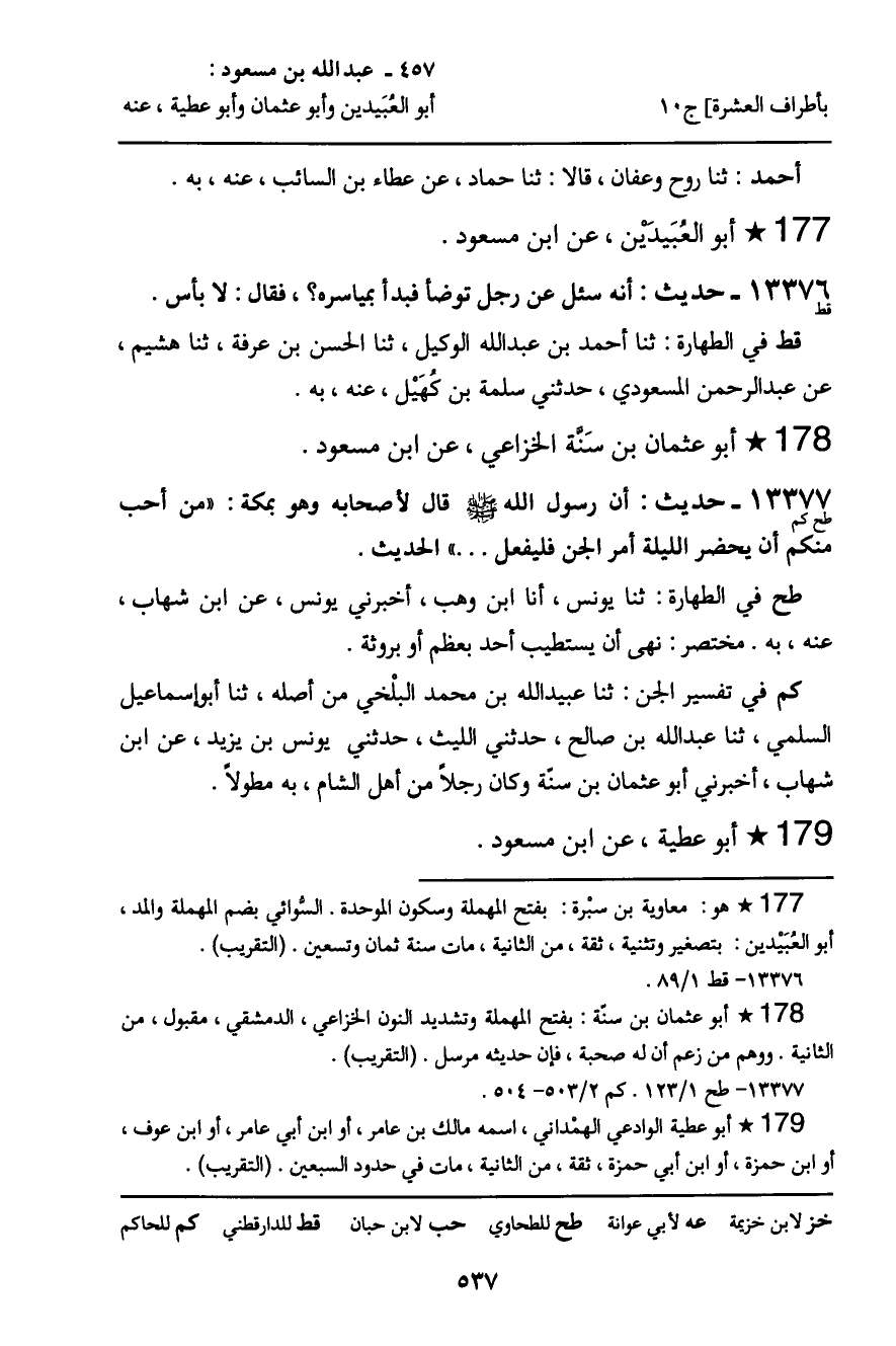 13377 - حديث (طح كم) : أبو عثمان بن سنة الخزاعي، عن ابن مسعود " أن رسول الله صلى الله عليه وسلم قال لأصحابه وهو بمكة: " من أحب منكم أن يحضر الليلة أمر الجن فليفعل. . . " الحديث.