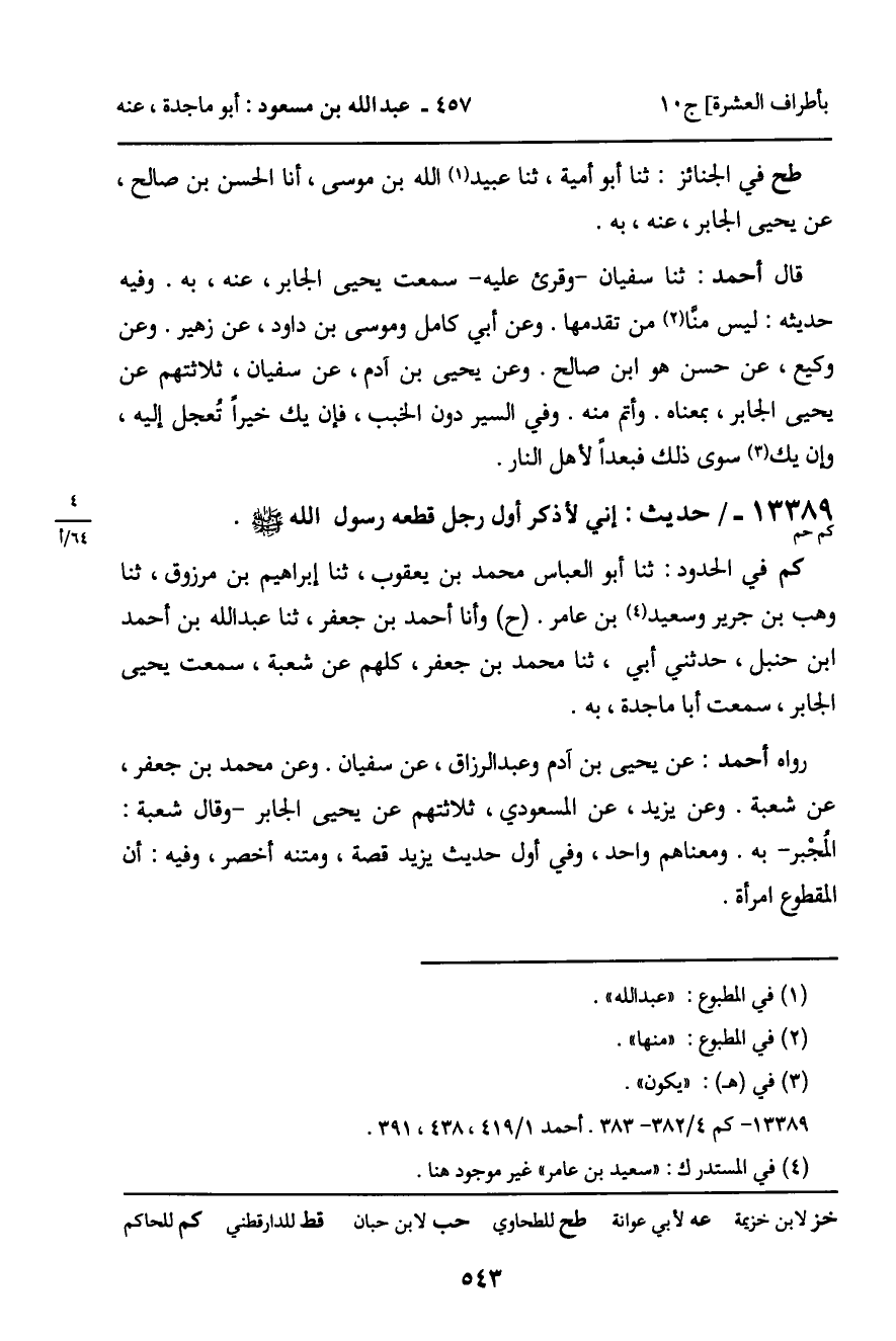 رواه أحمد: عن يحيى بن آدم، وعبد الرزاق، عن سفيان. وعن محمد بن جعفر، عن شعبة. وعن يزيد، عن المسعودي، ثلاثتهم عن يحيى الجابر، وقال شعبة: المجبر، به. ومعناهم واحد، وفي أول حديث يزيد قصة، ومتنه أخصر، وفيه: أن المقطوع امرأة.