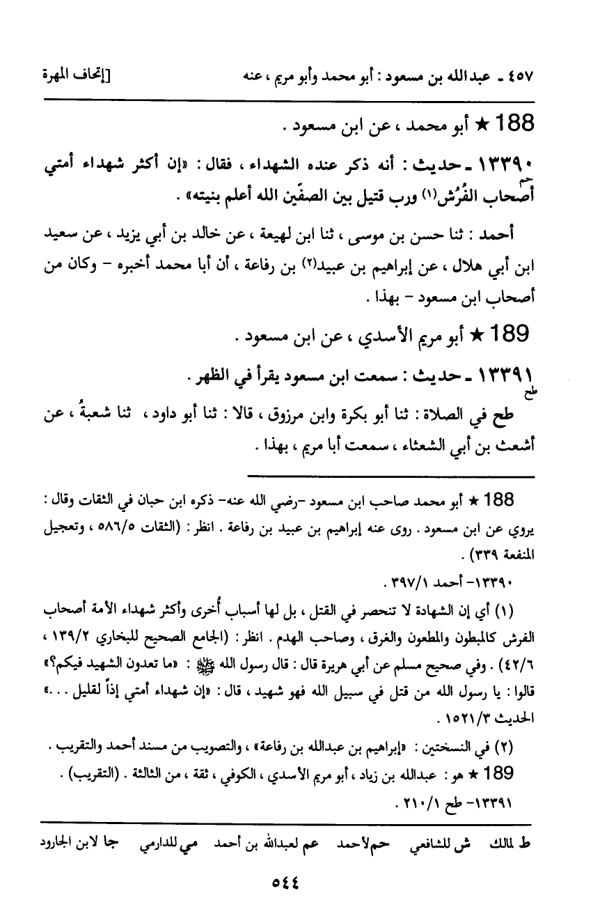 13390 - حديث (حم) : أبو محمد، عن ابن مسعود أنه ذكر عنده الشهداء، فقال: " إن أكثر شهداء أمتي أصحاب الفرش ورب قتيل بن الصفين الله أعلم بنيته ".