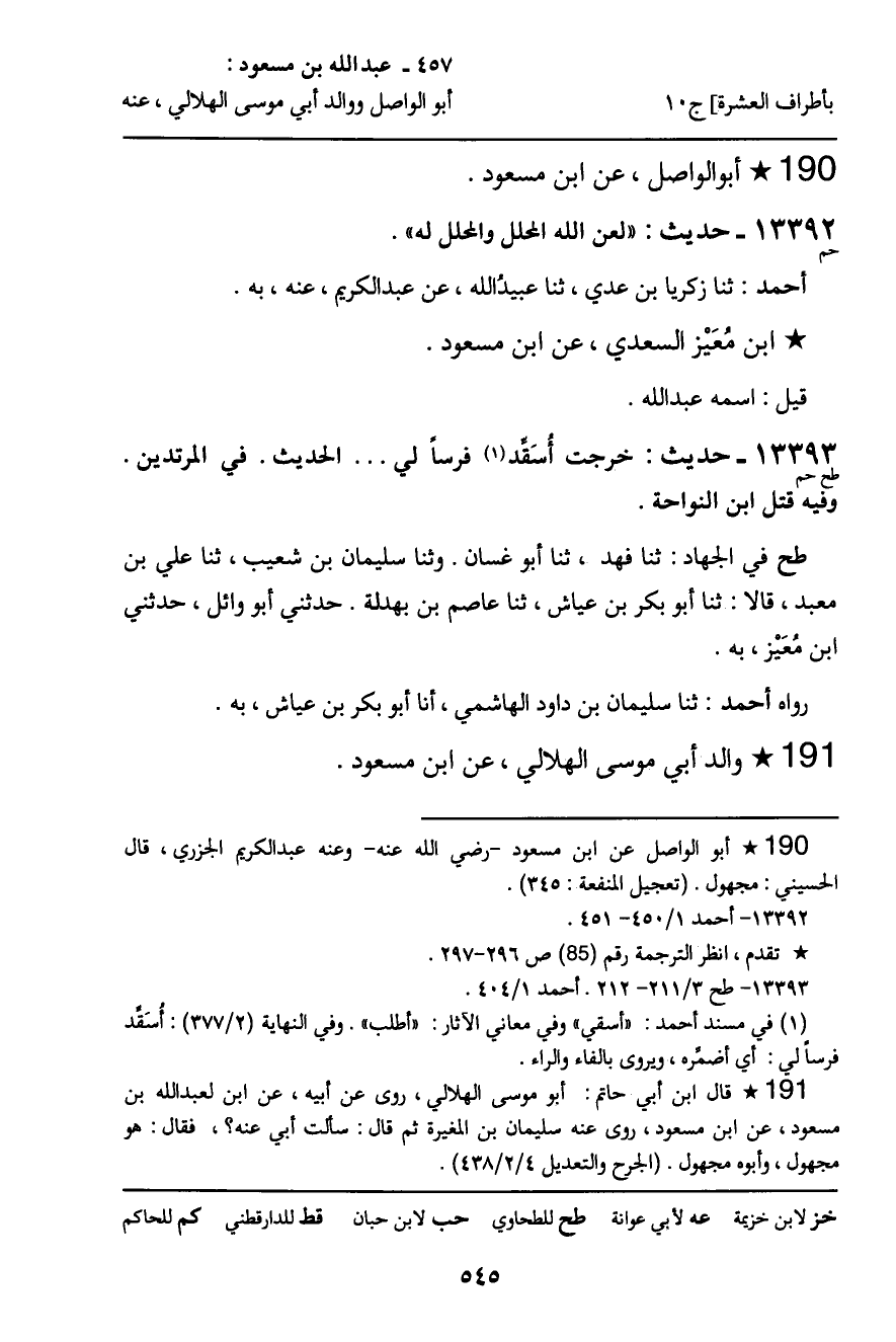 13393 - حديث (طح حم) : ابن مُعَيز السعدي، عن ابن مسعود " خرجت أسقد فرسا لي. . . " الحديث. في المرتدين. وفيه قتل ابن النواحة.