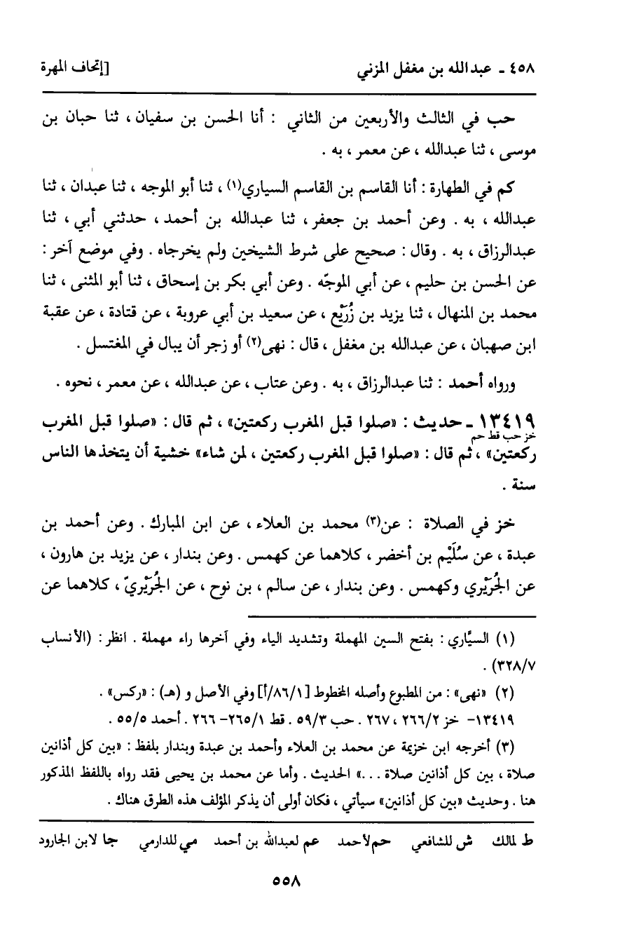 13419 - حديث (خز حب قط حم) : " صلوا قبل المغرب ركعتين "، ثم قال: " صلوا قبل المغرب ركعتين "، ثم قال: " صلوا قبل المغرب ركعتين، لمن شاء " خشية أن يتخذها الناس سنة.