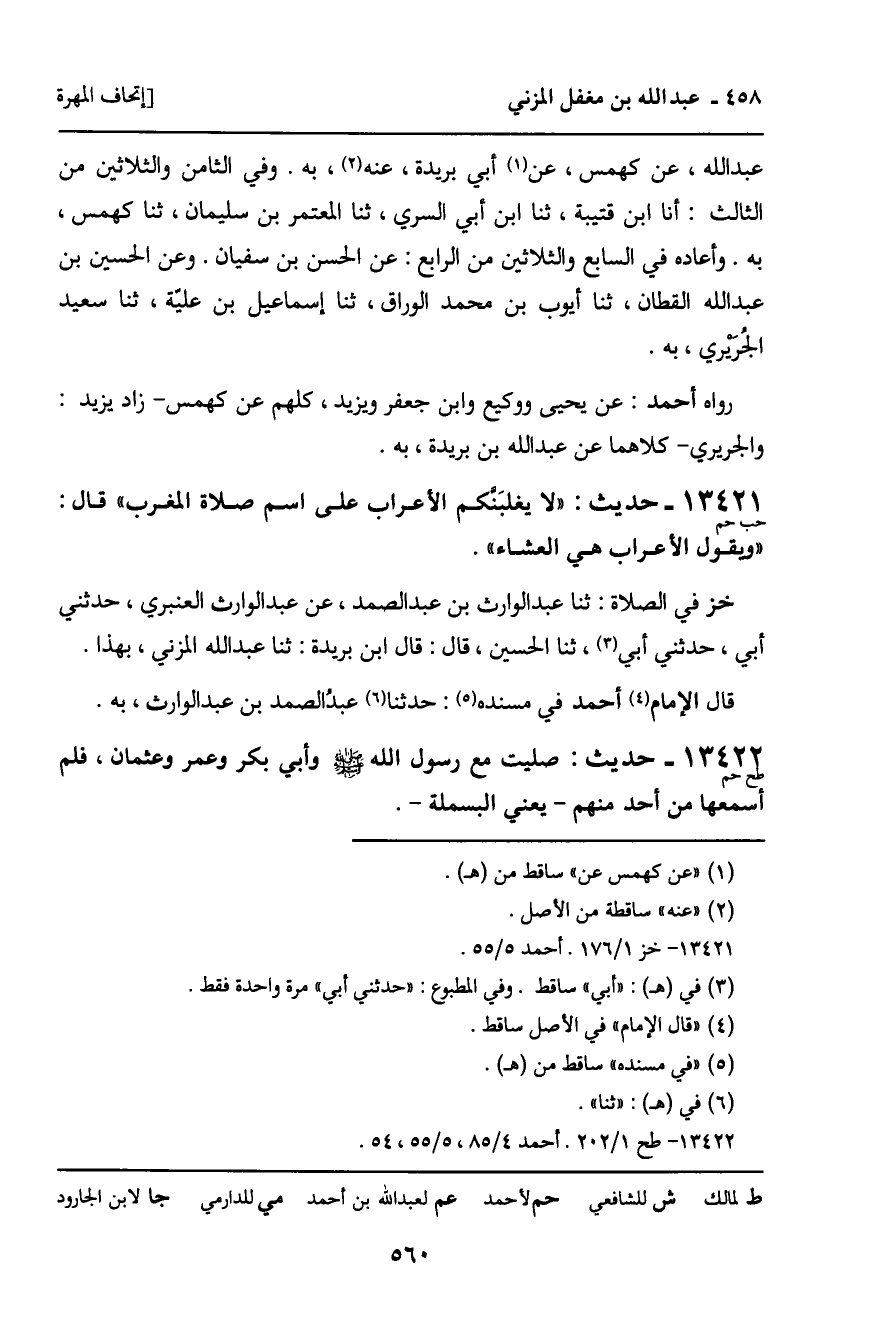 13421 - حديث (حب حم) : " لا يغلبنكم الأعراب على اسم صلاة المغرب " قال: " ويقول الأعراب هي العشاء ".