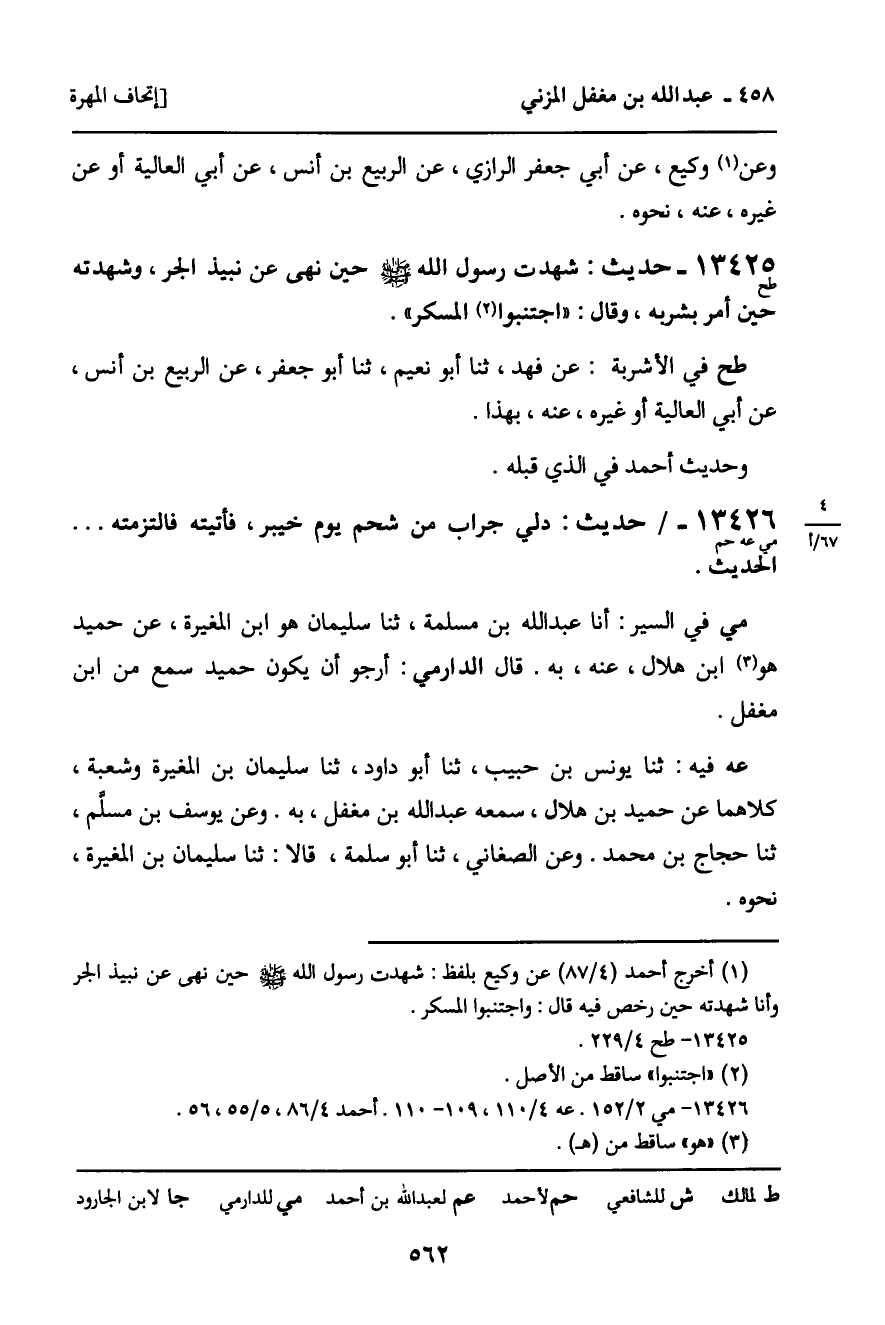 13425 - حديث (طح) : شهدت رسول الله صلى الله عليه وسلم حين نهى عن نبيذ الجر، وشهدته حين أمر بشربه، وقال: " اجتنبوا المسكر ".