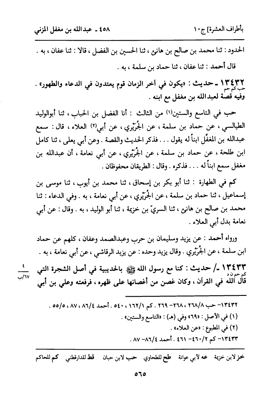 13432 - حديث (حب كم حم) : " يكون في آخر الزمان قوم يعتدون في الدعاء والطهور " وفيه قصة لعبد الله بن مغفل مع ابنه.