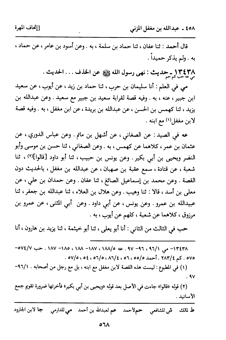 13438 - حديث (مي عه حب كم حم) : " نهى رسول الله صلى الله عليه وسلم عن الحذف. . . " الحديث.