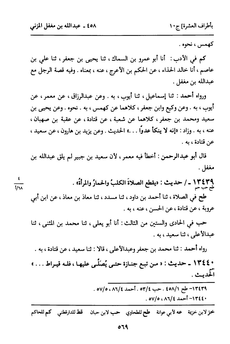 13439 - حديث (طح حب حم) : " يقطع الصلاة الكلب والحمار والمرأة ".