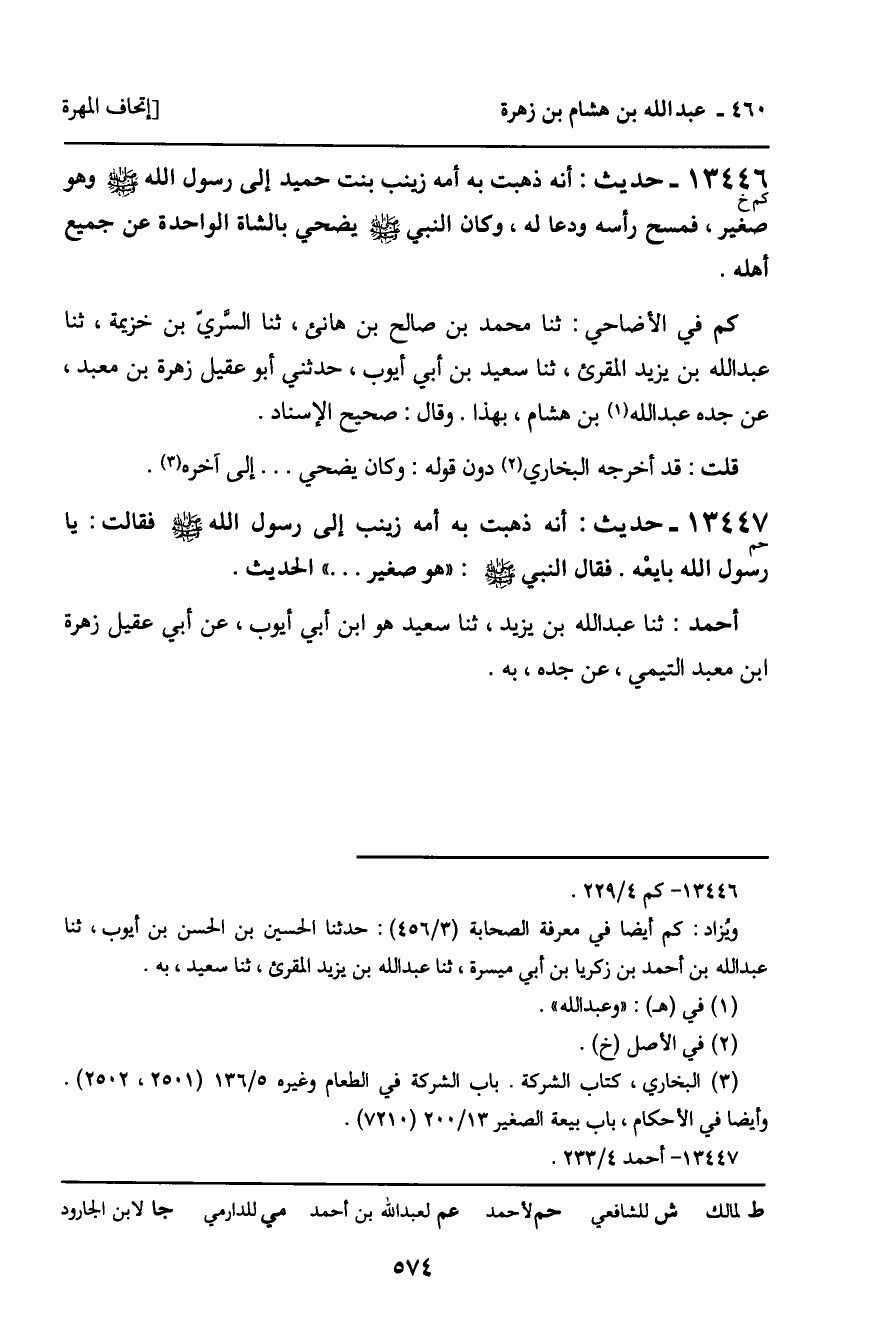 كم في الأضاحي: ثنا محمد بن صالح بن هانئ، ثنا السري، بن خزيمة، ثنا عبد الله بن يزيد المقرئ، ثنا سعيد بن أبي أيوب، حدثني أبو عقيل زهرة بن معبد، عن جده عبد الله بن هشام، بهذا. وقال: صحيح الإسناد.