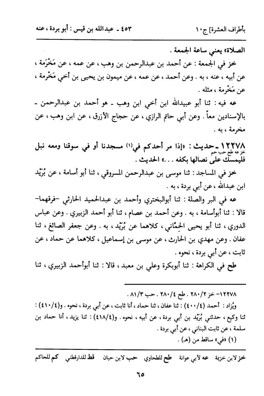 12278 - حديث (خز عه طح حب حم) : " إذا مر أحدكم في مسجدنا أو في سوقنا ومعه نبل فليمسك على نصالها بكفه. . . " الحديث.