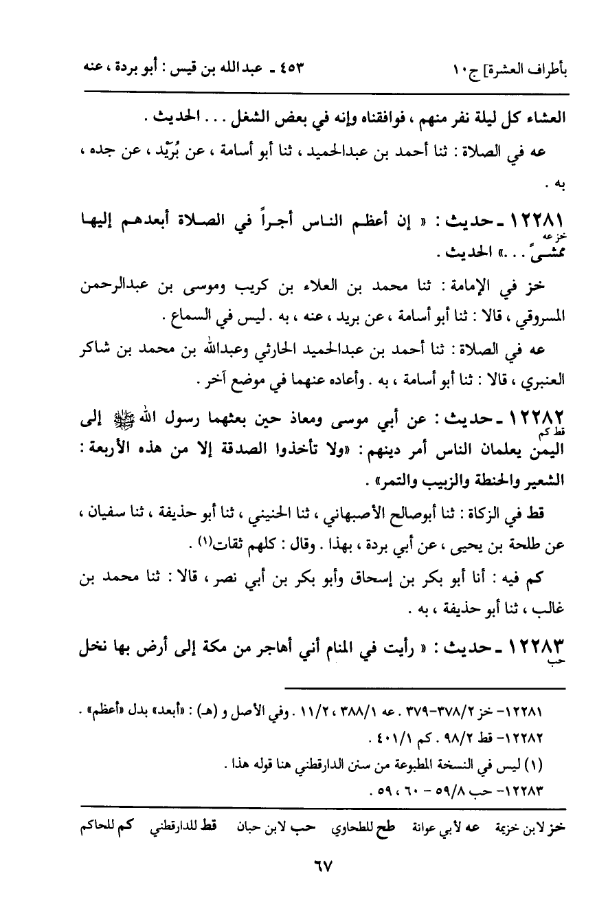 قط في الزكاة: ثنا أبو صالح الأصبهاني، ثنا الحنينين، ثنا أبو حذيفة، ثنا سفيان، عن طلحة بن يحيى، عن أبي بردة، بهذا. وقال: كلهم ثقات.