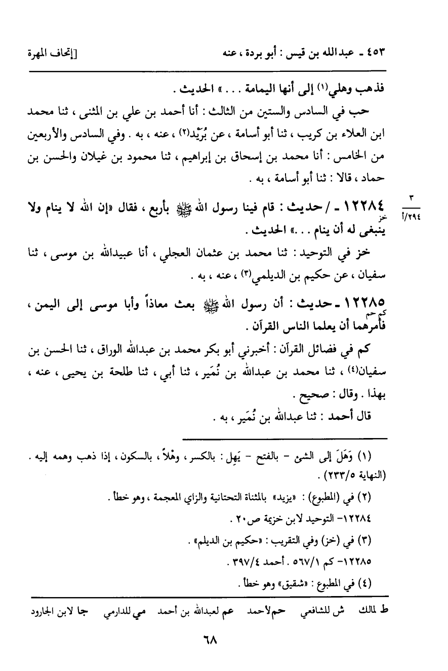 كم في فضائل القرآن: أخبرني أبو بكر محمد بن عبد الله الوراق، ثنا الحسن بن سفيان، ثنا محمد بن عبد الله بن نمير، ثنا أبي، ثنا طلحة بن يحيى، عنه، بهذا. وقال: صحيح.