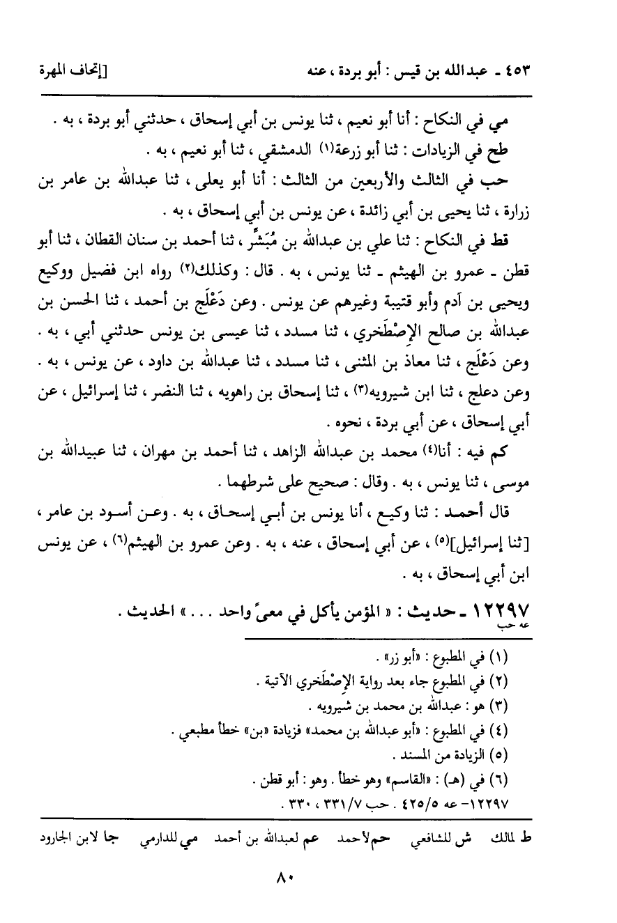 حب في الثالث عشر من الثالث: أنا الحسن بن أحمد بن إبراهيم بن فيل البالسي، ثنا محمد بن العلاء بن كريب، ثلاثتهم عن أبي أسامة، عن بريد، عنه، به. وفي الخامس والتسعين من الأول: أنا أبو يعلى، ثنا أبو كريب، به.