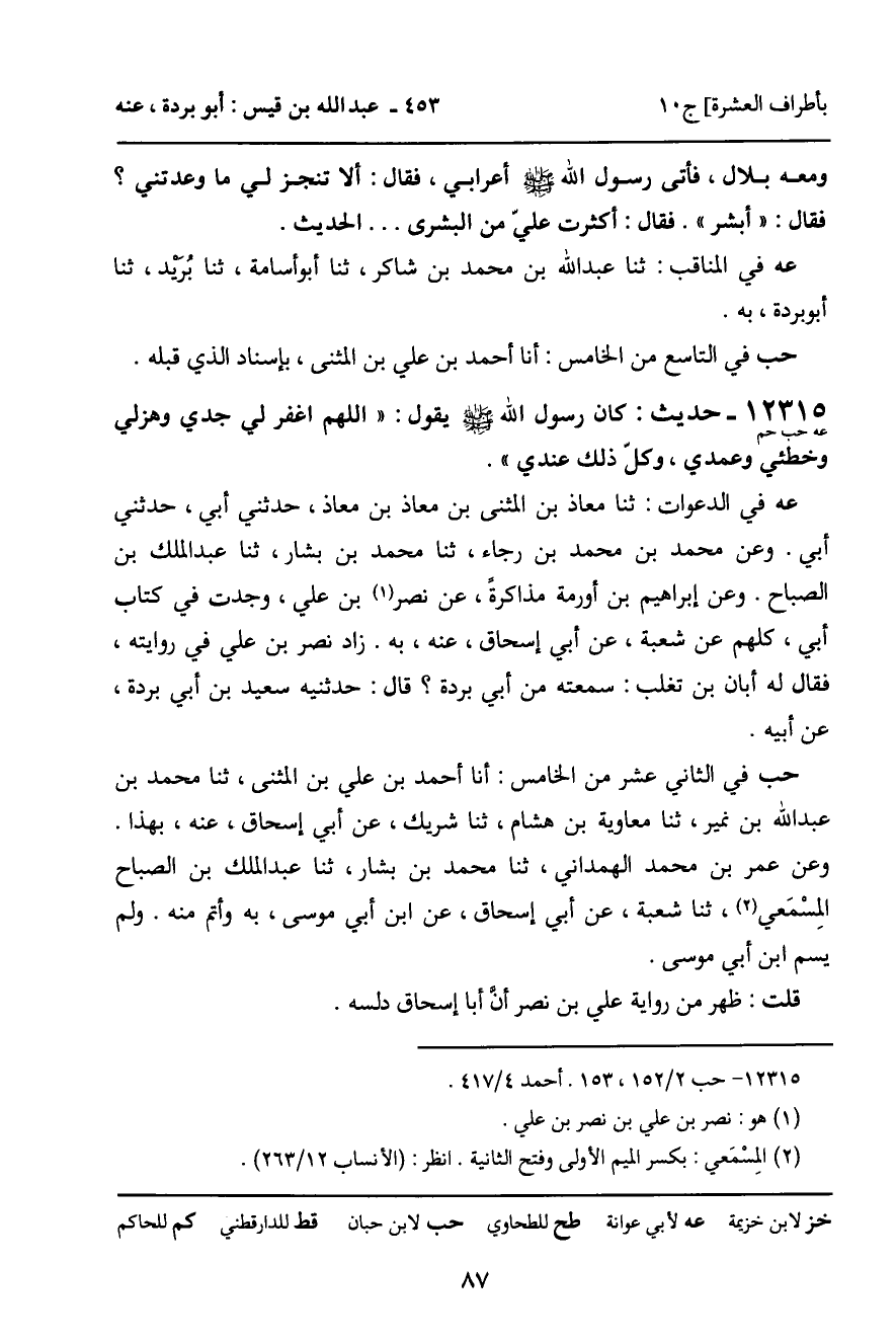 عه في الدعوات: ثنا معاذ بن المثنى بن معاذ، حدثني أبي، وعن محمد بن رجاء، ثنا محمد بن بشار، ثنا عبد الملك بن الصباح. وعن إبراهيم بن أورمة مذاكرة، عن نصر بن علي، وجدت كتاب أبي، كلهم عن شعبة، عن أبي إسحاق، عنه، به. زاد نصر بن علي وجدت في كتاب أبي، كلهم عن شعبة، عن أبي إسحاق، عنه، به. زاد نصر بن علي روايته، فقال له أبان بن تغلب: سمعته من أبي بردة؟ قال: حدثنيه سعيد بن أبي بردة، عن أبيه.