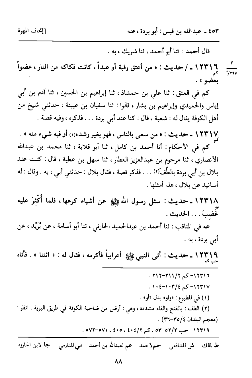 كم في العتق: ثنا علي بن حمشاذ، ثنا إبراهيم بن الحسين، ثنا آدم بن أبي إياس، والحميدي، وإبراهيم بن بشار، قالوا: ثنا شفيان بن عيينة، حدثني شيخ من أهل الكوفة يقال له: شعبة، قال: كنا عند أبي بردة. . . فذكره، وفيه قصة.
