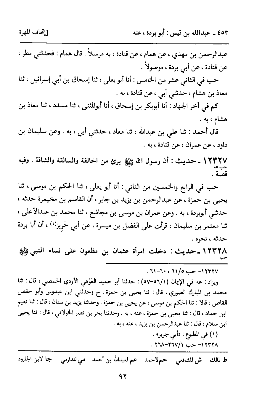 حب في الرابع والخمسين من الثاني: أنا أبو يعلى، ثنا الحكم بن موسى، ثنا يحيى بن حمزة، عن عبد الرحمن بن يزيد بن جابر، أن القاسم بن مخيمرة حدثه، حدثني أبو بردة، به. وعن عمران بن موسى بن مجاشع، ثنا محمد بن عبد الأعلى، ثنا معتمر بن سليمان، قرأت على الفضل بن ميسرة، عن أبي حريز، أن أبا بردة حدثه، نحوه.