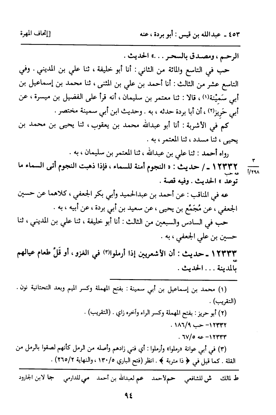حب في السادس والسبعين من الثالث: أنا أبو خليفة، ثنا علي بن المديني، ثنا حسين بن علي الجعفي، به.