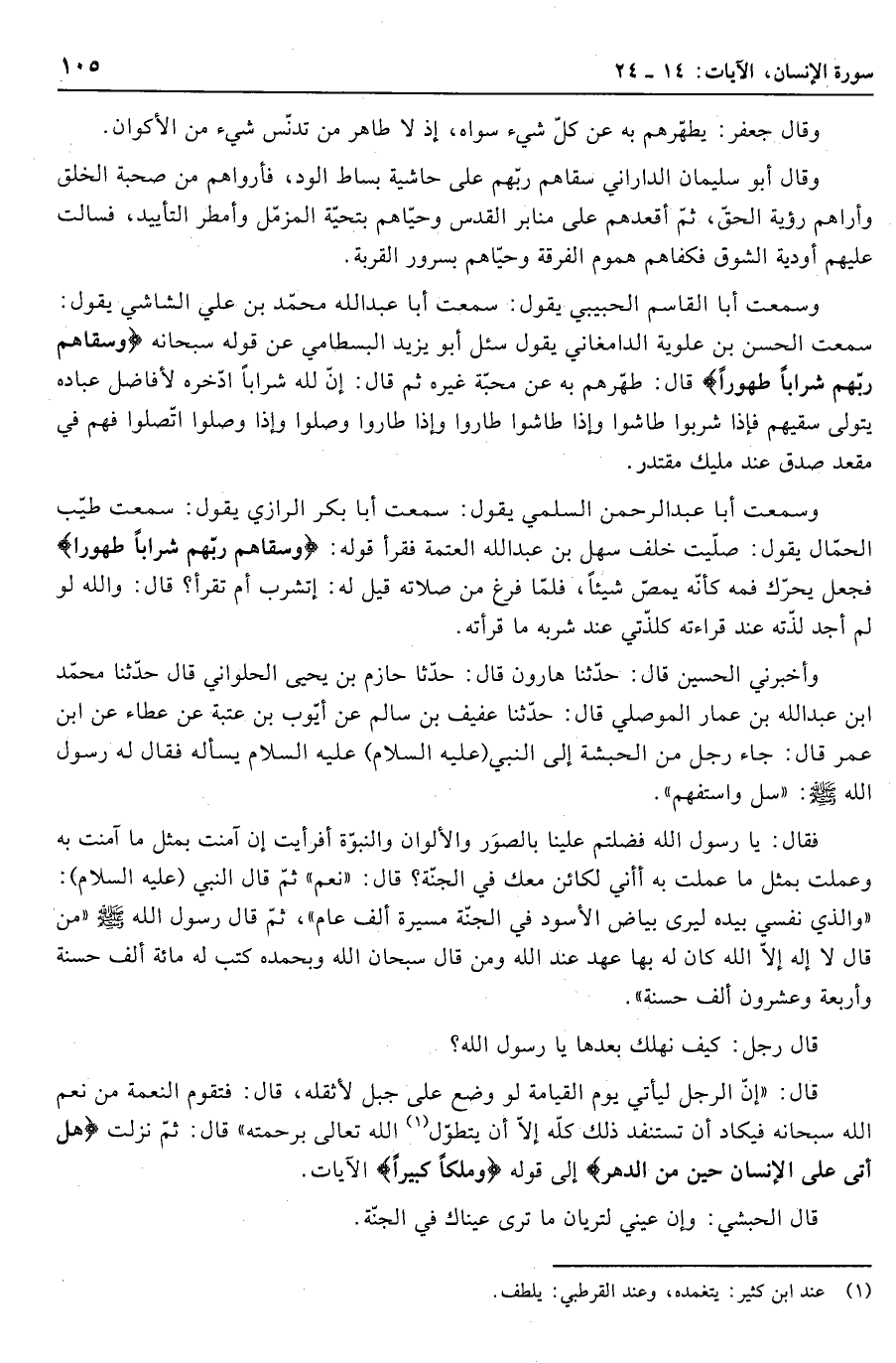 وسمعت أبا عبد الرحمن السلمي يقول: سمعت أبا بكر الرازي يقول: سمعت طيّب الحمّال يقول: صلّيت خلف سهل بن عبد الله العتمة فقرأ قوله: وَسَقاهُمْ رَبُّهُمْ شَراباً طَهُوراً فجعل يحرّك فمه كأنّه يمصّ، فلمّا فرغ من صلاته قيل له: أتشرب أم تقرأ؟ قال: والله لو لم أجد لذّته عند قراءته كلذّتي عند شربه ما قرأته.