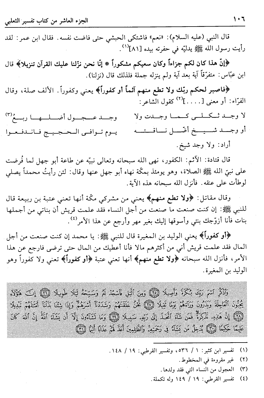 إِنَّ هذا كانَ لَكُمْ جَزاءً وَكانَ سَعْيُكُمْ مَشْكُوراً إِنَّا نَحْنُ نَزَّلْنا عَلَيْكَ الْقُرْآنَ تَنْزِيلًا قال ابن عبّاس: متفرّقا آية بعد آية ولم ينزله جملة فلذلك قال (نَزَّلْنا) ...