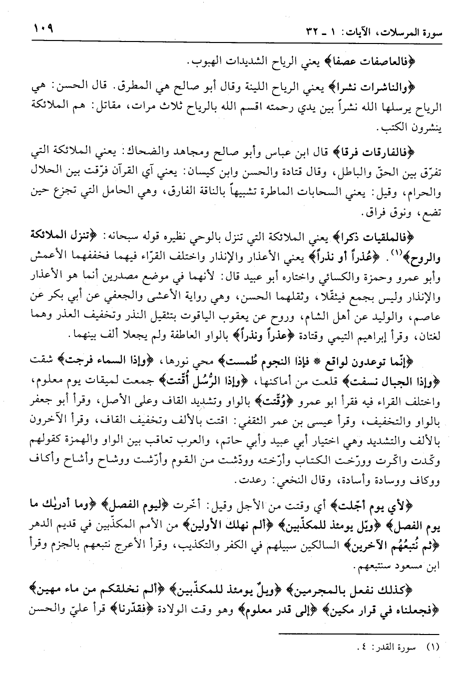 إِنَّما تُوعَدُونَ لَواقِعٌ فَإِذَا النُّجُومُ طُمِسَتْ محي نورها، وَإِذَا السَّماءُ فُرِجَتْ شقت وَإِذَا الْجِبالُ نُسِفَتْ قلعت من أماكنها، وَإِذَا الرُّسُلُ أُقِّتَتْ جمعت لميقات يوم معلوم، واختلف القراء فيه فقرأ ابو عمرو وقّتت بالواو وتشديد القاف وعلى الأصل، وقرأ أبو جعفر بالواو والتخفيف، وقرأ عيسى بن عمر الثقفي: أُقِتَتْ بالألف وتخفيف القاف، وقرأ الآخرون بالألف والتشديد وهي اختيار أبي عبيد وأبي حاتم، والعرب تعاقب بين الواو والهمزة كقولهم وكّدت واكّرت وورّخت الكتاب وأرّخته وودّشت من القوم وأرّشت ووشاح وأشاح وأكاف ووكاف ووسادة وأسادة، وقال النخعي: رعدت.