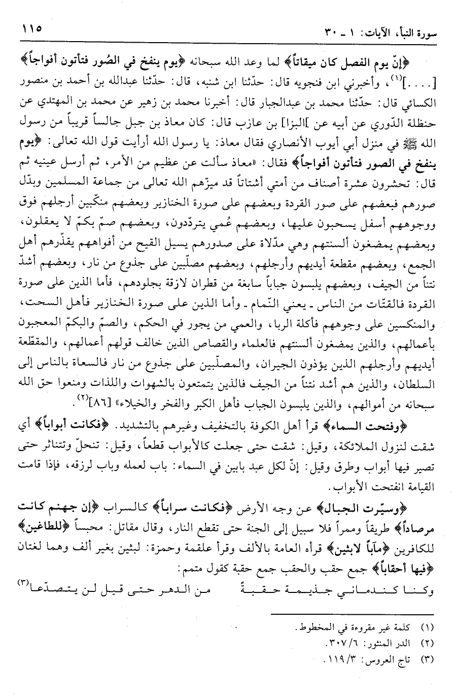 وأخبرني ابن فنجويه قال: حدّثنا ابن شنبه، قال: حدّثنا عبد الله بن أحمد بن منصور الكسائي قال: حدّثنا محمد بن عبد الجبار قال: أخبرنا محمد بن زهير عن محمد بن المهتدي عن حنظلة الدّوري عن أبيه عن [البزا] بن عازب قال: كان معاذ بن جبل جالسا قريبا من رسول الله صلى الله عليه وسلم في منزل أبي أيوب الأنصاري فقال معاذ: يا رسول الله أرأيت قول الله تعالى: يَوْمَ يُنْفَخُ فِي الصُّورِ فَتَأْتُونَ أَفْواجاً فقال: «معاذ سألت عن عظيم من الأمر، ثم أرسل عينيه ثم قال: تحشرون عشرة أصناف من أمتي أشتاتا قد ميّزهم الله تعالى من جماعة المسلمين وبدّل صورهم فبعضهم على صور القردة وبعضهم على صورة الخنازير وبعضهم منكبّين أرجلهم فوق ووجوههم أسفل يسحبون عليها، وبعضهم عمي يتردّدون، وبعضهم صُمٌّ بُكْمٌ ... لا يَعْقِلُونَ، وبعضهم يمضغون ألسنتهم وهي مدلّاة على صدورهم يسيل القيح من أفواههم يقذّرهم أهل الجمع، وبعضهم مقطعة أيديهم وأرجلهم، وبعضهم مصلّبين على جذوع من نار، وبعضهم أشدّ نتنا من الجيف، وبعضهم يلبسون جبابا سابغة من قطران لازقة بجلودهم، فأما الذين على صورة القردة فالقتّات من الناس- يعني النّمام- وأما الذين على صورة الخنازير فأهل السحت، والمنكسين على وجوههم فأكلة الربا، والعمي من يجور في الحكم، والصمّ والبكم المعجبون بأعمالهم، والذين يمضغون ألسنتهم فالعلماء والقصاص الذين خالف قولهم أعمالهم، والمقطّعة أيديهم وأرجلهم الذين يؤذون الجيران، والمصلّبين على جذوع من نار فالسعاة بالناس إلى السلطان، والذين هم أشد نتنا من الجيف فالذين يتمتعون بالشهوات واللذات ومنعوا حق الله سبحانه من أموالهم، والذين يلبسون الجباب فأهل الكبر والفخر والخيلاء» [86] «2» .