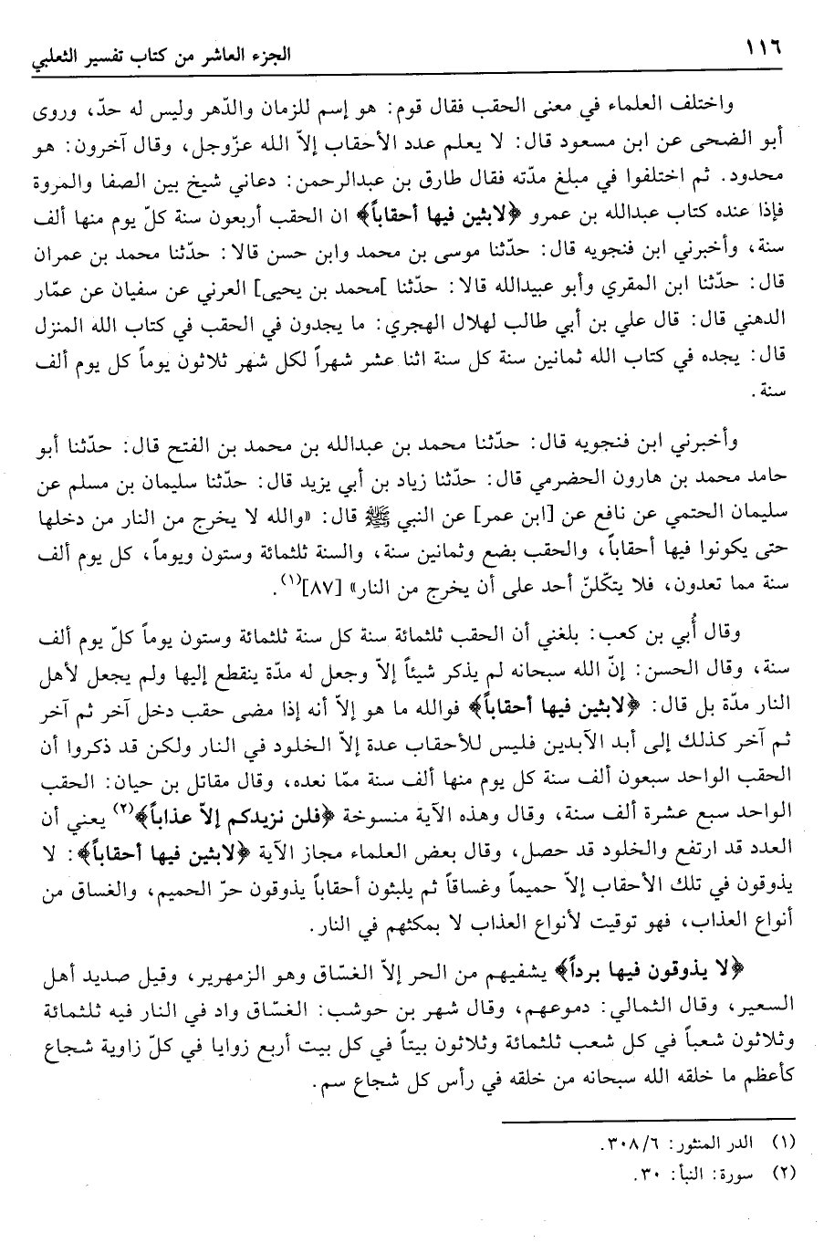 واختلف العلماء في معنى الحقب فقال قوم: هو اسم للزمان والدّهر وليس له حدّ، وروى أبو الضحى عن ابن مسعود قال: لا يعلم عدد الأحقاب إلّا الله عزّ وجل، وقال آخرون: هو محدود. ثم اختلفوا في مبلغ مدّته فقال طارق بن عبد الرحمن: دعاني شيخ بين الصفا والمروة فإذا عنده كتاب عبد الله بن عمرو لابِثِينَ فِيها أَحْقاباً ان الحقب أربعون سنة كلّ يوم منها ألف سنة،