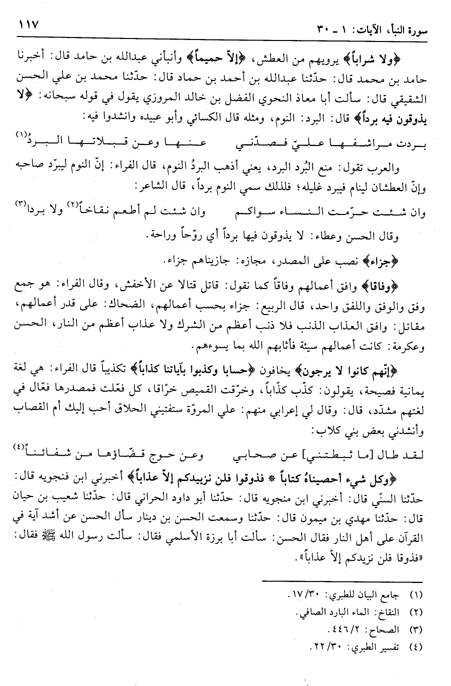 وَلا شَراباً يرويهم من العطش، إِلَّا حَمِيماً وأنبأني عبد الله بن حامد قال: أخبرنا حامد بن محمد قال: حدّثنا عبد الله بن أحمد بن حماد قال: حدّثنا محمد بن علي الحسن الشقيقي قال: سألت أبا معاذ النحوي الفضل بن خالد المروزي يقول في قوله سبحانه: لا يَذُوقُونَ فِيها بَرْداً قال: البرد: النوم، ومثله قال الكسائي وأبو عبيده وانشدوا فيه: