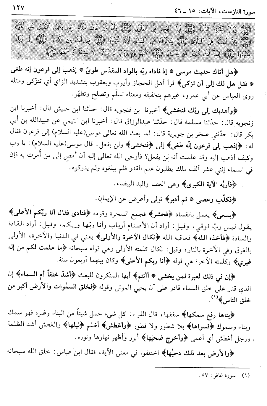 وَأَهْدِيَكَ إِلى رَبِّكَ فَتَخْشى أخبرنا ابن فنجويه قال: حدّثنا ابن حبيش قال: أخبرنا ابن زنجويه قال: حدّثنا مسلمة قال: حدّثنا عبد الرزاق قال: أخبرنا ابن التيمي عن عبيد الله بن أبي بكر قال: حدّثني صخر بن جويرية قال: لما بعث الله تعالى موسى (عليه السلام) إلى فرعون فقال له: اذْهَبْ إِلى فِرْعَوْنَ إِنَّهُ طَغى إلى فَتَخْشى ولن يفعل. قال موسى (عليه السلام) : يا رب وكيف أذهب إليه وقد علمت أنه لن يفعل؟ فأوحى الله تعالى إليه أن أمض إلى من أمرت به فإن في السماء اثني عشر ألف ملك يطلبون علم القدر فلم يبلغوه ولم يدركوه.