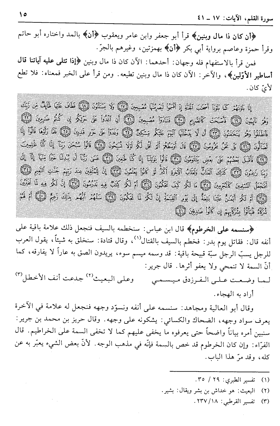 سَنَسِمُهُ عَلَى الْخُرْطُومِ (16) إِنَّا بَلَوْناهُمْ كَما بَلَوْنا أَصْحابَ الْجَنَّةِ إِذْ أَقْسَمُوا لَيَصْرِمُنَّها مُصْبِحِينَ (17) وَلا يَسْتَثْنُونَ (18) فَطافَ عَلَيْها طائِفٌ مِنْ رَبِّكَ وَهُمْ نائِمُونَ (19) فَأَصْبَحَتْ كَالصَّرِيمِ (20)