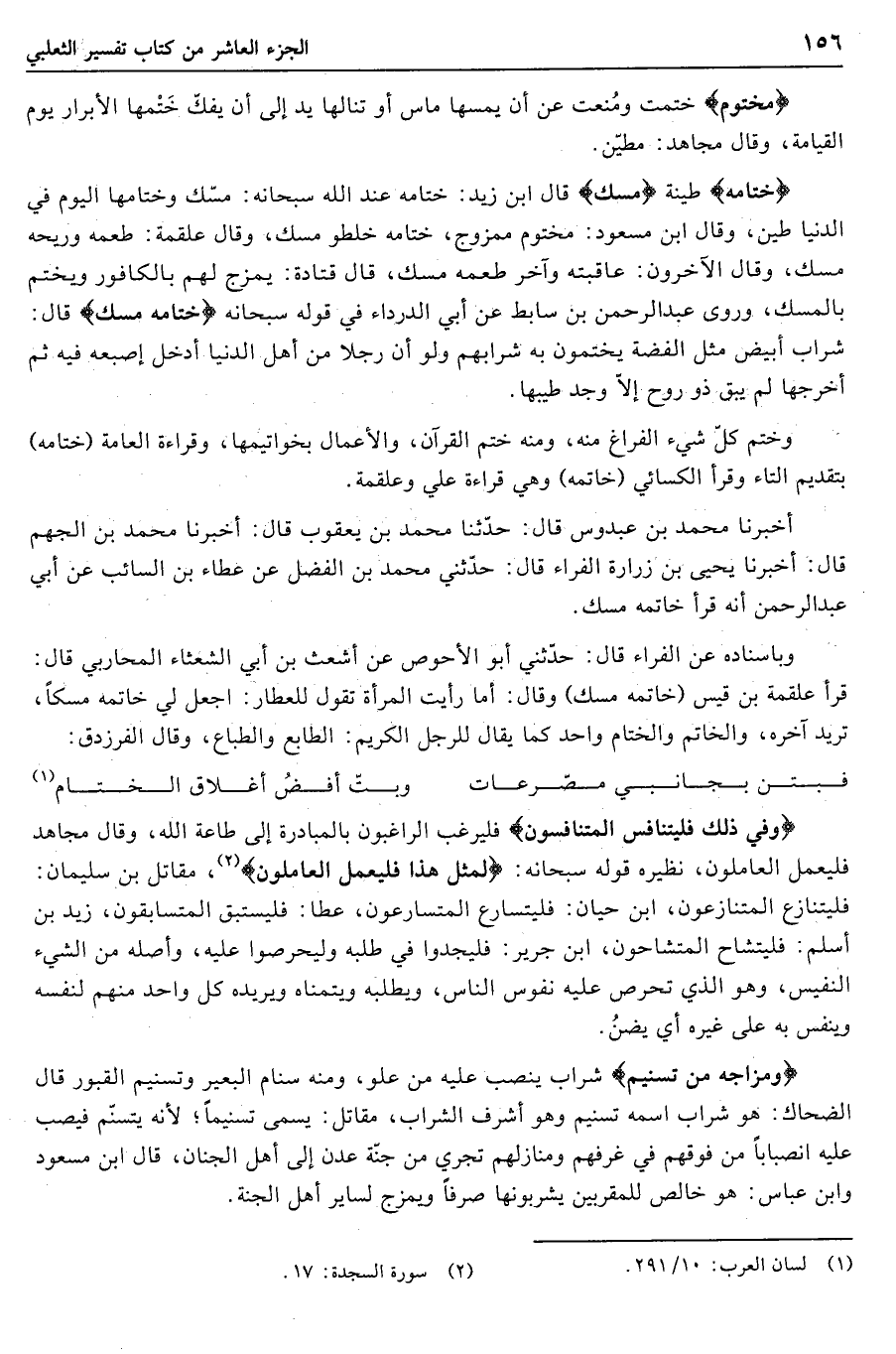 خِتامُهُ طينة مِسْكٌ قال ابن زيد: خِتامُهُ عند الله سبحانه: مِسْكٌ وختامها اليوم في الدنيا طين، وقال ابن مسعود: مختوم ممزوج، ختامه خلط ومسك، وقال علقمة: طعمه وريحه مسك، وقال الآخرون: عاقبته وآخر طعمه مسك، قال قتادة: يمزج لهم بالكافور ويختم بالمسك، وروى عبد الرحمن بن سابط عن أبي الدرداء في قوله سبحانه خِتامُهُ مِسْكٌ قال: